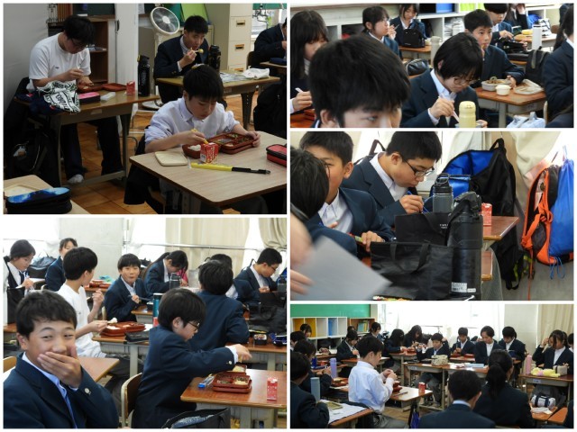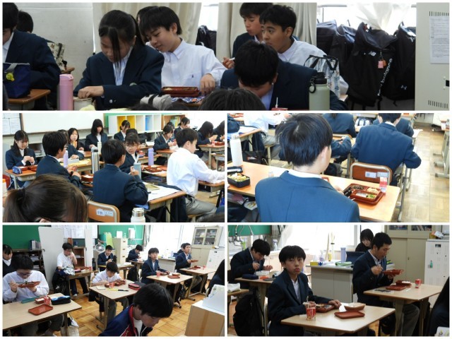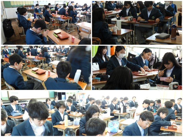 各教室ではみんながそろって「いただきます」をしています。