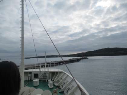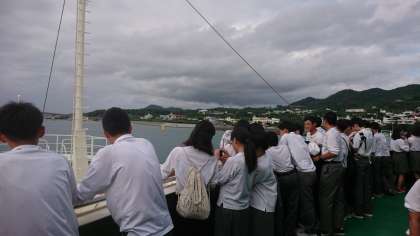 伊江島に向けてフェリーは本部港を出航しています。約30分の乗船ですので,間もなく到着する頃かと思われます。フェリーに乗るのが初めての生徒が多く、みんな景色や潮風を楽しんでいます。