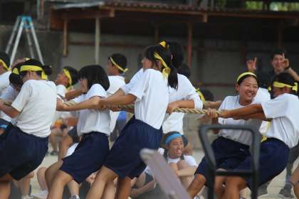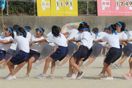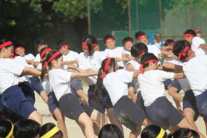 今年から色別対抗も取り入れ,新しい種目の色別対抗綱引き。3つの学年が協力して綱を引き合う姿は輝いていました。