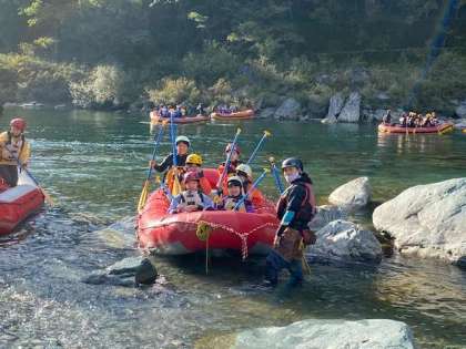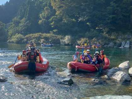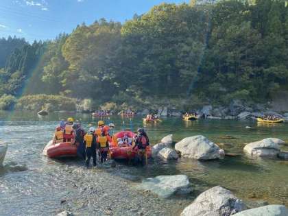 午前中の小雨から一転、青空の下、吉野川ラフティング体験を満喫してます。