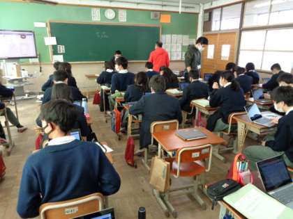 GIGAタブレットを使って,課題に解答していったり,席を動かすことなくグループ学習がどのように出来るか等を現在,授業で取り組んでいます。今年度中には全生徒分が配置されるので,今からの準備が大切ですね。
