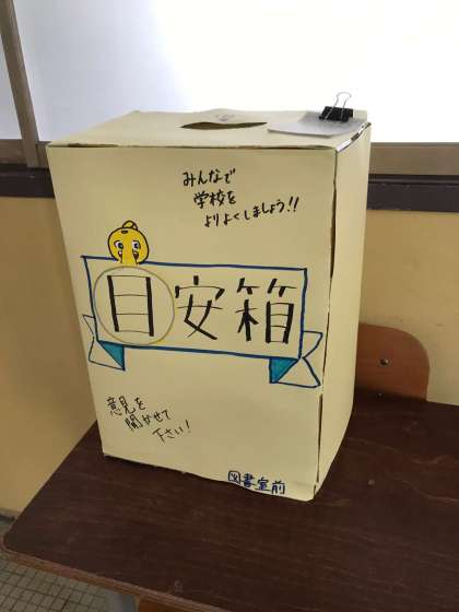 本日より1週間,生徒会活動の一つとして目安箱を設置しました。全校生徒でより良い学校を創りたいとの生徒会本部の考えで企画が始まり,いよいよスタートとなりました。みんなが前向きに考える機会にして,さらに学校を良くしていきましょう。
