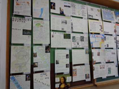 3年生の美術での課題レポート作品が美術室に飾られました。改めてみると,しっかりまとめて書けるように成長しましたね。