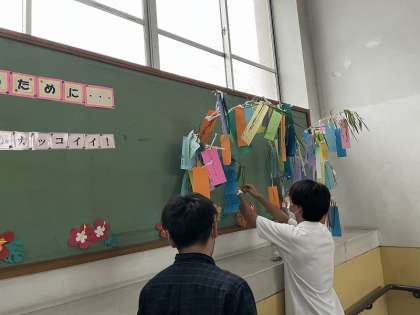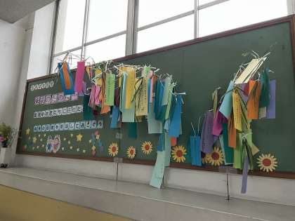 今日は七夕ということで,願いを短冊に込めました。「周りの人が健康でいられますように」,「プロ野球選手になれますように」,「テストでいい点数が取れますように」など,それぞれが想い想いに書いていました。