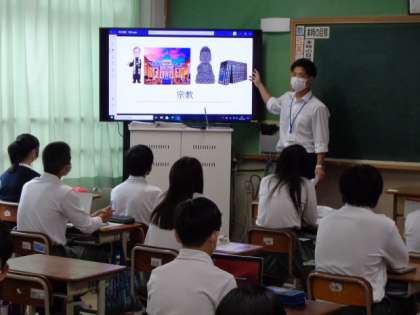 教育実習生が授業に取り組んでいます。まだまだ,緊張した面持ちで教壇に立っていますが,パソコンの扱いはさすがになれたもの,液晶テレビにつないでわかりやすく授業を進めようと頑張っています。