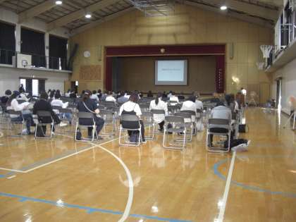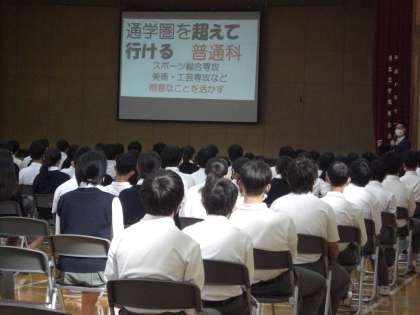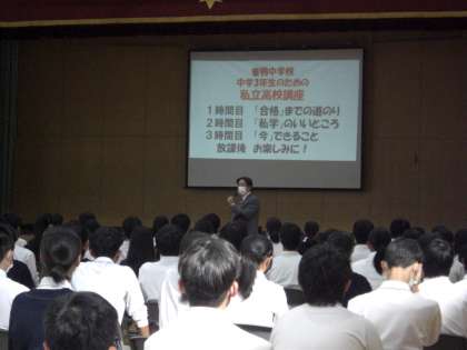 本日5,6限に進路学活及び進路保護者説明会を行いました。5限には京都府立洛東高校と京都文教高校から講師をお招きし,3年生生徒に向けて公立私立それぞれの特色や学習内容・入試制度等についてお話しいただきました。生徒たちは、とても真剣に聞き入っていました。
