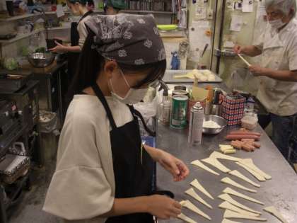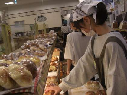 写真は1日目のパン屋での様子です。商品並べや,厨房でパン作りもさせていただいたようです。