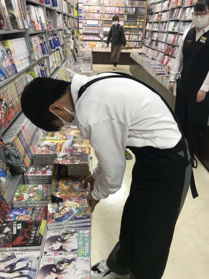 商品の本を並べています。自分の並べた本がお客様の手に届くといいですね。