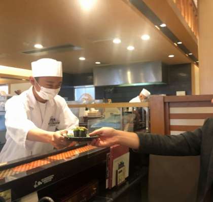 ホールではお客様への商品提供など,厨房では寿司職人さんの見学をさせていただきました。