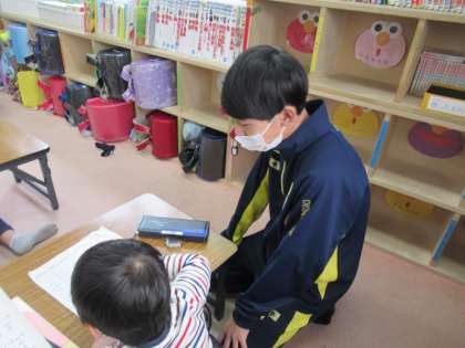左の写真は,児童館で子どもと接している様子です。児童館の先生からは,子どもと積極的に関わってもらっています,とお褒めの言葉もいただきました。