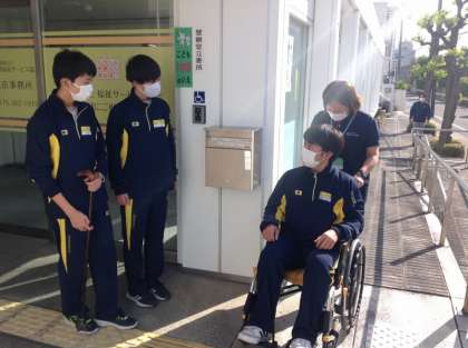 左の写真は,福祉サービスの事業所での様子です。車いすを使って,実習もさせていただきました。
