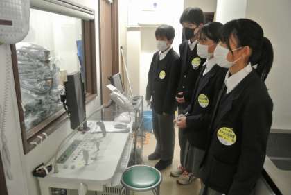 中の写真は,病院での様子です。実際の医療機器の見学や講義での学習など,病院ならではの勉強をさせていただいています。