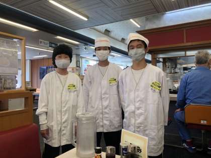 右の写真は,中華料理屋での様子です。スタッフの方にも丁寧に教えていただき,仕事も少しずつ慣れてきたようです。