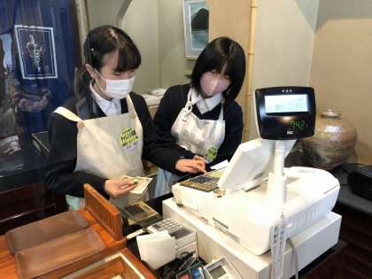 左の写真は京菓子屋です。レジ打ちをしている様子です。レジに立っている雰囲気が,お店に馴染みつつありますね。