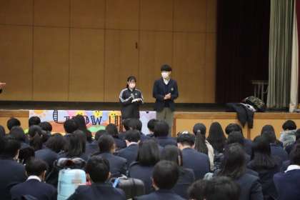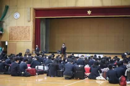 修学旅行に向かう3年生の結団式が行われました。実行委員会の司会で、挨拶や添乗員さん・カメラマンさんとの顔あわせを行いました。 「Grow up ともに成長し互いに友情を深めよう」のテーマを合い言葉に、安全で楽しい修学旅行にしていきましょう。