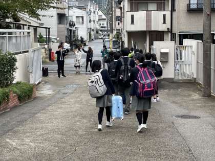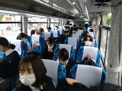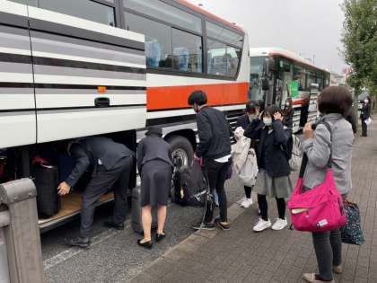 7時50分頃より最初のクラスが学校を出発し、バスの方へ移動し始めました。ちょうど雨もやみ、少し肌寒い中、きれいに列を作って移動しています。白馬方面への修学旅行、いろいろなものを吸収してきてください。