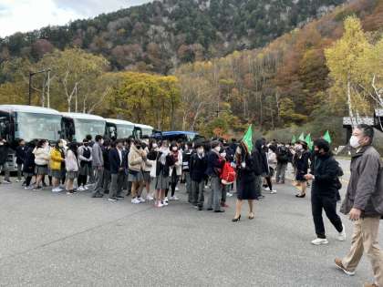 前半クラス(1組〜4組,10組男子)は扇沢駅に到着です。今からトロリーバス(電気バス)です。