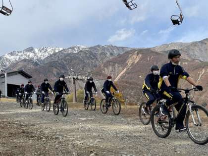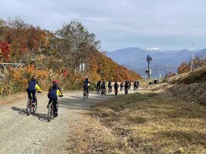 マウンテンバイク体験本番です。周囲の紅葉がとても綺麗です。走っていると手が痛くなります。明日が心配です。