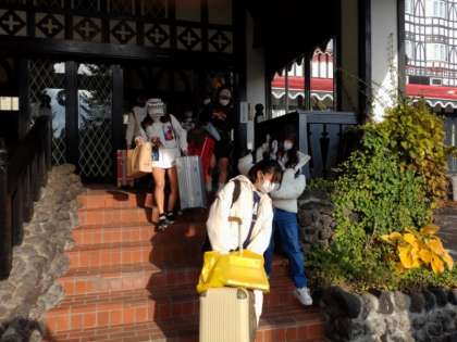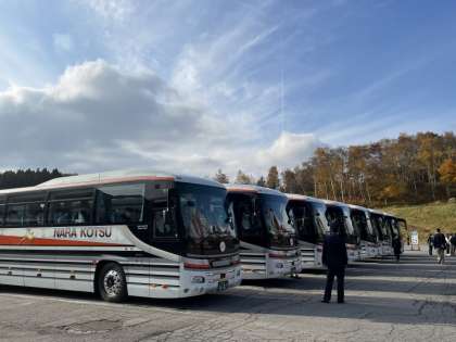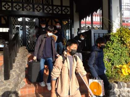 出発に向けて、バスへ移動する様子です。天気は快晴、ぽかぽか陽気です。ホテルの皆さん、お世話になりました。