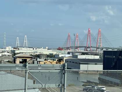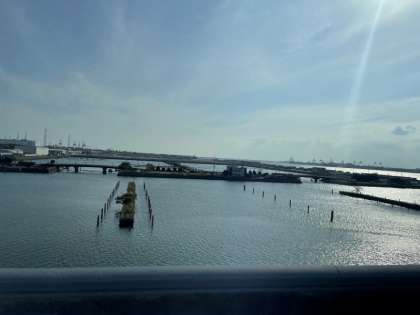 ナガシマスパーランドまであと少し。バスから海が見えます。工業地帯が広がっています。