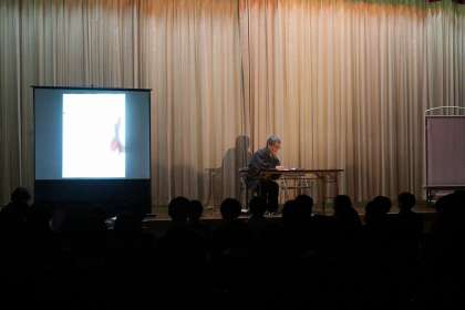 重厚な展開の中にホッとする笑いも交えながらの演技に生徒たちは食い入るように見ていました。劇のメッセージががひとりひとりの心の中に入り込んでいることを願っています。古森先生有難うございました。