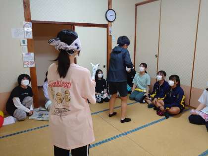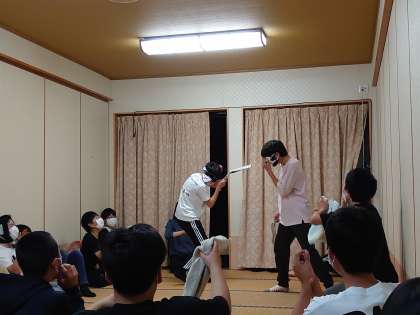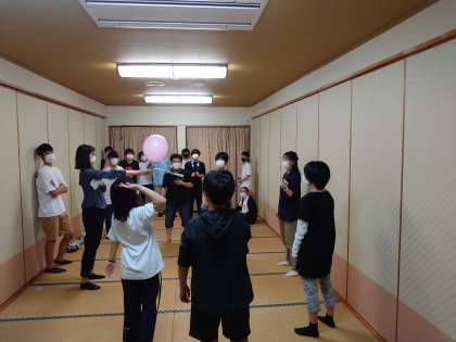 楽しみにしていたクラスレクリエーション。まず、気配切りです。目隠しをして相手の気配を探る様子に、盛り上がっています。風船バレーは男女対抗で盛り上がっています。気付けば汗びっしょりです。