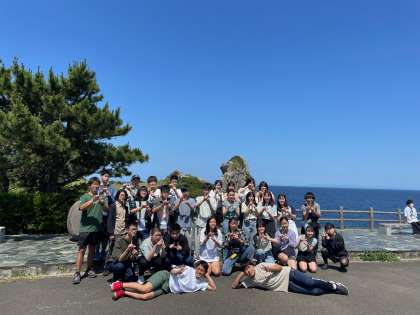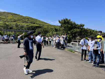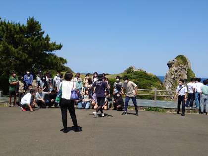 すっかり快晴です。猿岩にて学年写真とクラス写真を撮っています。この角度で見るとまさに猿の横顔です。