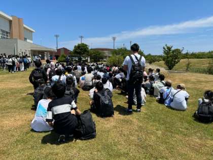昼食後、選択別体験学習に向かいます。写真はマリンスポーツ体験グループ。注意事項をしっかり聞いて体験スタートです!