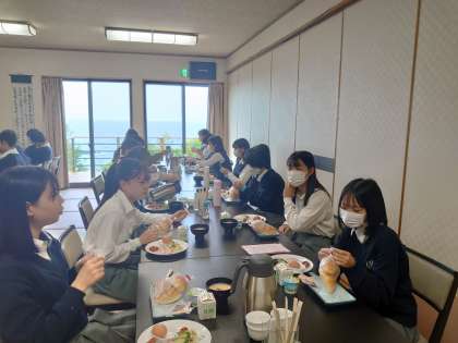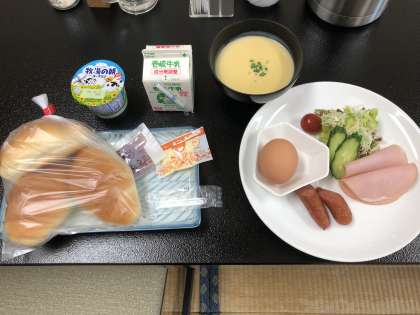 今朝はパン食です。写真は6組の朝食風景。おいしくいただきした。
