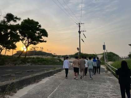 少し戻って、7組の朝の散歩風景です。おだやかな空と海が広がります。