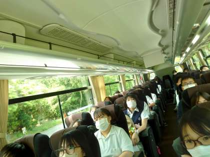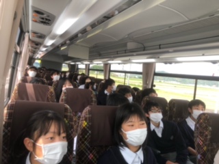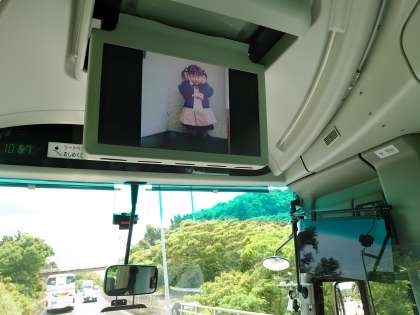 バスレクが始まりました。修学旅行委員さん力作のDVDが流れます。子供の頃の写真を見て、どの先生か当てるクイズです。バスの画面に写る可愛い女の子は誰でしょう??