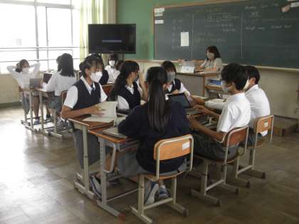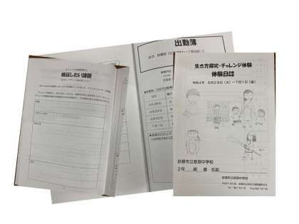 2年生は、2週間後に控えた「チャレンジ体験学習」に向け、事業所別事前学習をスタートしています。今日は、前時に引き続き、事業所への行き方・所要時間等を調べ、さらに今回の体験で検証したいこと(=検証課題)について考える時間でした。今年度ご協力いただく事業所は、全部で60箇所以上、校区内・山科区内が多いものの、それ以外の区の事業所がいくつかあります。「この前京都駅まで初めて電車で行った」「子どもだけでバス移動したことがあまりない」という人もおり、端末を使って調べ、メンバー全員で確認しながら、冊子に書き込む姿が見られました。