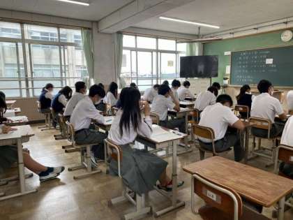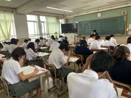 今日から、第2回定期テストが始まりました。1時間目の学習の後、全学年3教科のテストが行われました。開始の合図と同時に、みんな黙々と取り組みます。涼しい風が入ってくるので、窓や扉は開放しています。