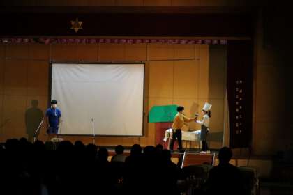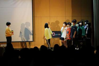 2年生は「チャレンジ体験」で学んだことをもとに、「オトえもん」と「はね太(羽太)」が登場する劇仕立ての発表でした。大きな鈴をつけたオトえもんの「クワシクマイク」により、職業紹介やダンス教室が登場します。