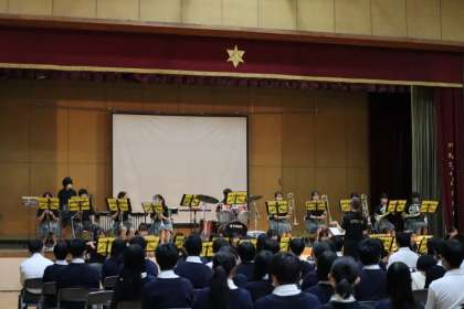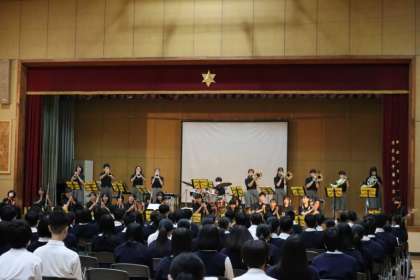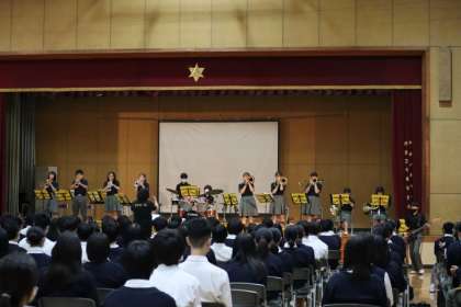 3年生の部では、吹奏楽部の華やかな演奏がありました。3年生が中心となって披露するソロ演奏、おなじみの嵐やジブリメドレー、ロックンロールの軽快な曲など、演奏者と聴衆が一緒に楽しめる音楽を披露してくれました。