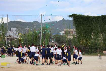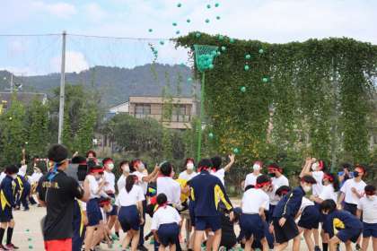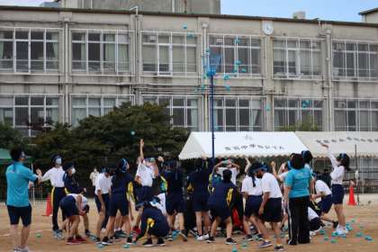 色別選択種目「玉入れ」です。「複数つかむ」「ジャンプする」等、技を使って、どの色も多くの玉が入りました。