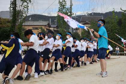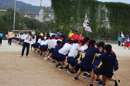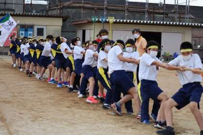 色別選択種目「綱引き」の様子です。力強いかけ声と共に、綱を引きます。