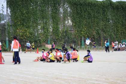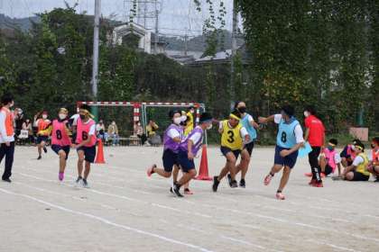 色別選択種目「リレー」の様子です。みんな、思いきり全力で走っています。競り合う場面では、応援の声が一段と大きくなりました。