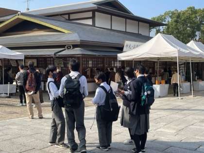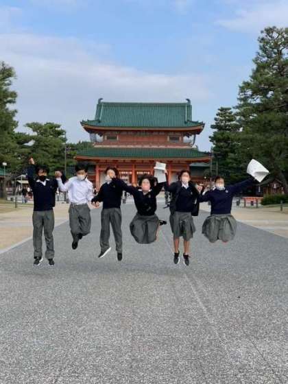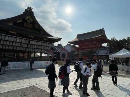 いくつかのの班は、最初の目的地に到着し、積極的にインタビューを開始しました。平安神宮の班、すでに10人に答えてもらったと喜んでいる班もあります。写真は平安神宮(上)と八坂神社(中・下)の様子。