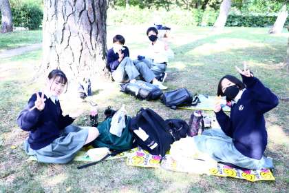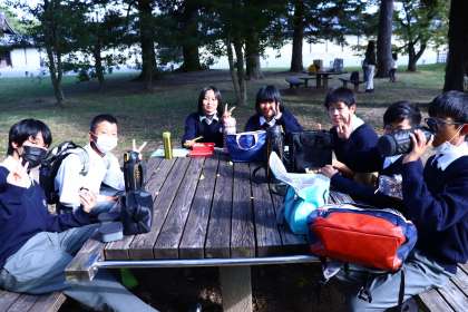 お昼ごろ、京都御所に各班が集まってきました。ぽかぽか陽気の中、昼食タイムです。午前に遅れがあった班は、計画を変更し、次のチェックポイントで昼食を取ることになりました。