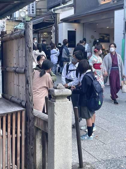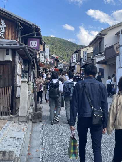 清水寺へと続く道。坂の途中で足を止め、お話を伺います。