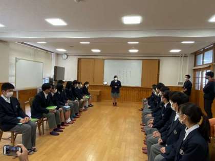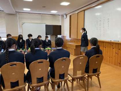 本日放課後、生徒会引継ぎ式が行われました。生徒会役員選挙で決定した新生徒会本部と旧生徒会本部、生徒会担当教員、学年教員などが集まり、いきいき交流ルームで実施しました。