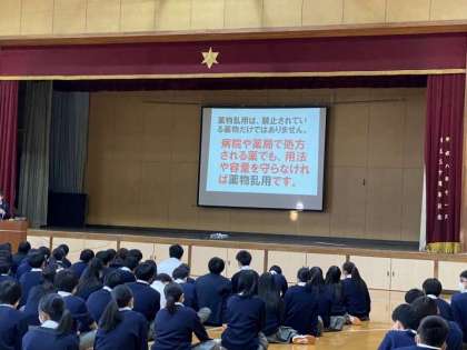 本日6限、京都府警より講師をお招きし、薬物乱用防止教室を実施しました。3年生7クラスが体育館に集合し、対面講義形式で行いました。「見ようと思って見ること」「聞こうと思って聞くこと」の大切さの話から始まり、「薬物による甚大な健康被害」「違法薬物の使用は犯罪」「SNS情報の怖さ」「薬物への巧みな誘い」「実際の被害の様子」等について、エピソードを交えてお話いただきました。「イライラが消える」「勉強がはかどる」等、巧みな誘いを断る強さが必要であること、違法薬物の問題は周囲の人々にも悪影響を与えてしまうこと等、短い時間に多くを学ぶ有意義な時間となりました。