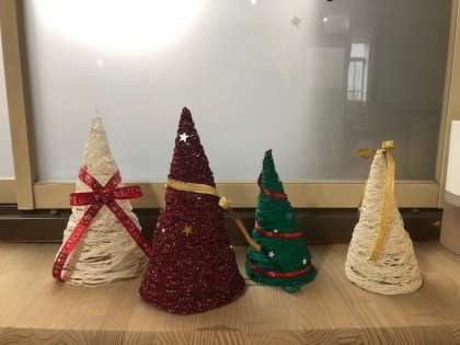校長室の入口の横に小さな棚があります。季節に合った小物を家庭科部の皆さんが作ってくれています。12月は「クリスマスツリー」です。紐をボンドで固めて作られています。見るたびに華やかな気持ちになります。ありがとう,家庭科部の皆さん。