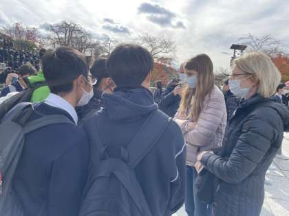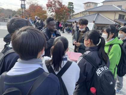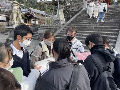 観光客でいっぱいの清水寺です。外国人への英語インタビューのミッション。はじめは、なかなか勇気が出ず、話し掛けるのに躊躇していました。が、勇気を振り絞って一度話しかけてみると、とっても親切に応えていただき、英語でのコミュニケーションを楽しめたようです。