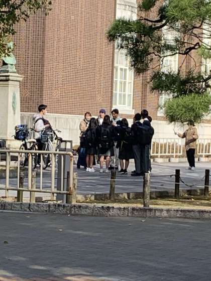京都大学にて。京大生にインタビューしている様子です。