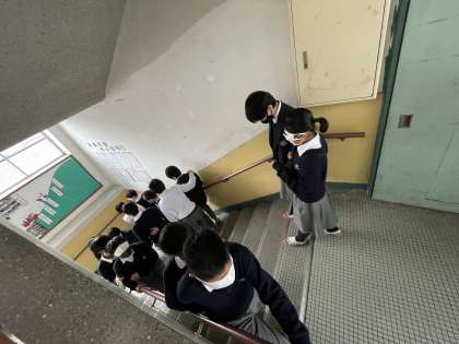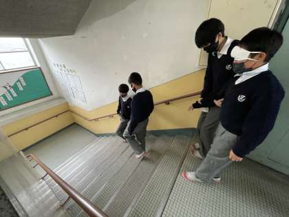 本日6限、1年生の人権学習では、視覚体験をおこないました。ペアを組み、1人がアイマスクをつけ、階段や廊下、グラウンドを歩く活動を行いました。