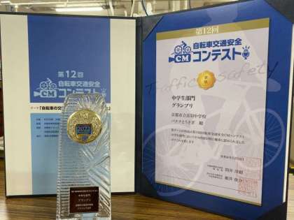 12月4日(日)に行われた「第12回自転車交通安全CMコンテスト」の表彰式で、本校2年生チーム「バナナとうさぎ」が、中学生部門グランプリを受賞しました。このコンテストは、京都における自転車の交通事故防止とマナーの向上を目的として、毎年開催されているものです。