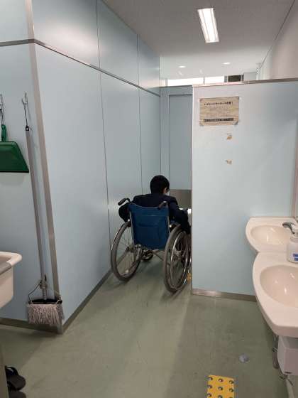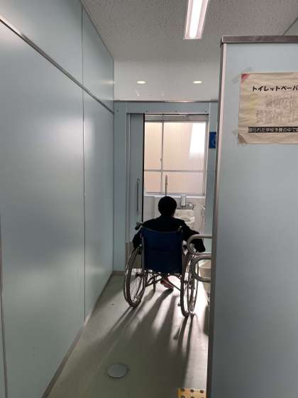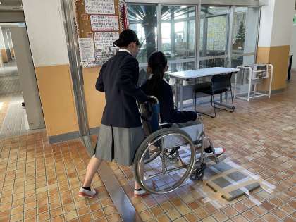 「スロープをあがってください。」のミッション、「でこぼこの上を通過してください」「トイレに入ってください」「砂利道を通ってください」等、さまざまなミッションがあらわれます。町を歩けば、遭遇しそうな状況とわかっていても、普段、困りなく通過している場所で、なかなか動けず、苦労している人が多くいました。車椅子に乗る人、車椅子を補助する人が、どんなことに気をつけ、どんな声かけを必要としているか、考えられる体験でした。お借りした17台の車椅子によって、貴重な学習ができたと思います。