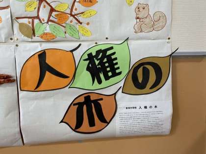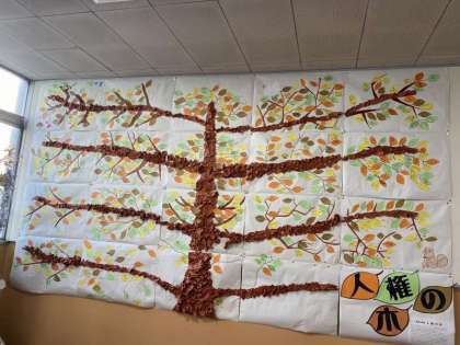 4日間の人権学習のまとめとして、全校で「人権の木」を制作しました。黄色、茶色、オレンジ、緑…色とりどりの葉っぱに書かれた一言メッセージが「人権の木」を彩る一枚の葉となり、いこいの間を飾っています。